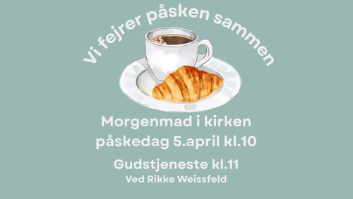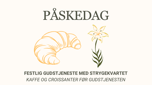 Påskedag er kirkens festdag! Og det markerer vi med en festlig gudstjeneste med strygekvartet. Men før gudstjenesten, byder vi på croissanter og kaffe klokken 10, og alle er velkomne til at lægge vejen forbi.